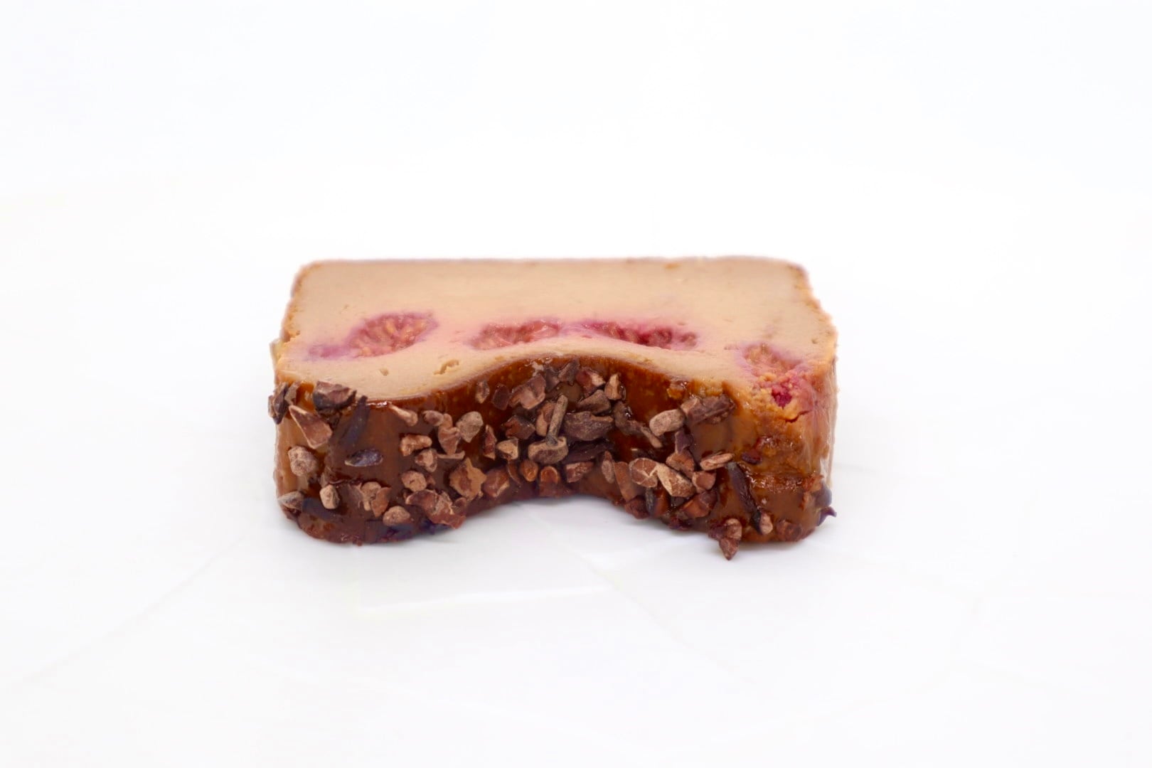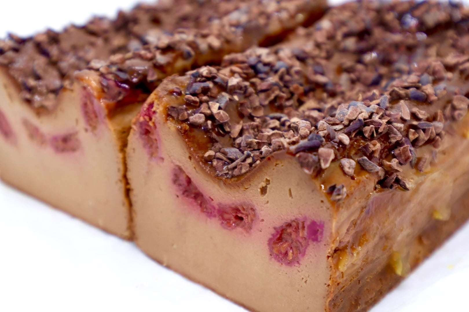 仕上げに何と世界中のパティシエ達から絶大なる信頼を誇るフランスヴァローナ社のカカオニブを贅沢に表面に張りつけています。